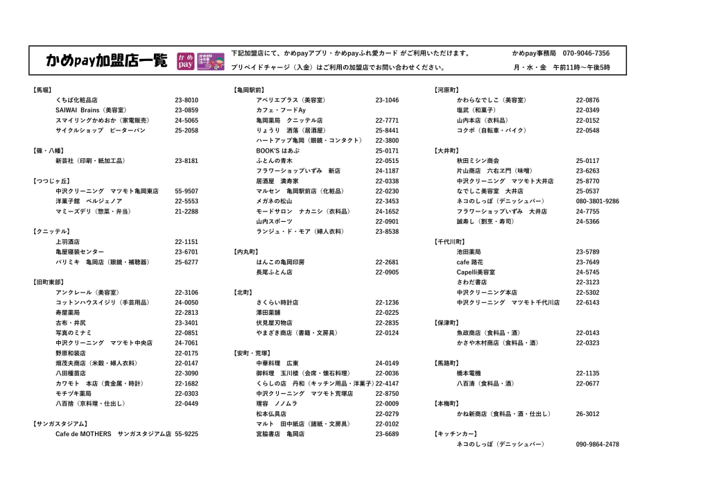亀岡市内の加盟店で使えるプリペイド型電子マネーです。『かめpay』は商店だけではなく、各種事業所や様々なサービスなど、あらゆる分野での利用を可能とし、地域内経済循環を高め、持続可能な地域経営を実現させることを目指します。